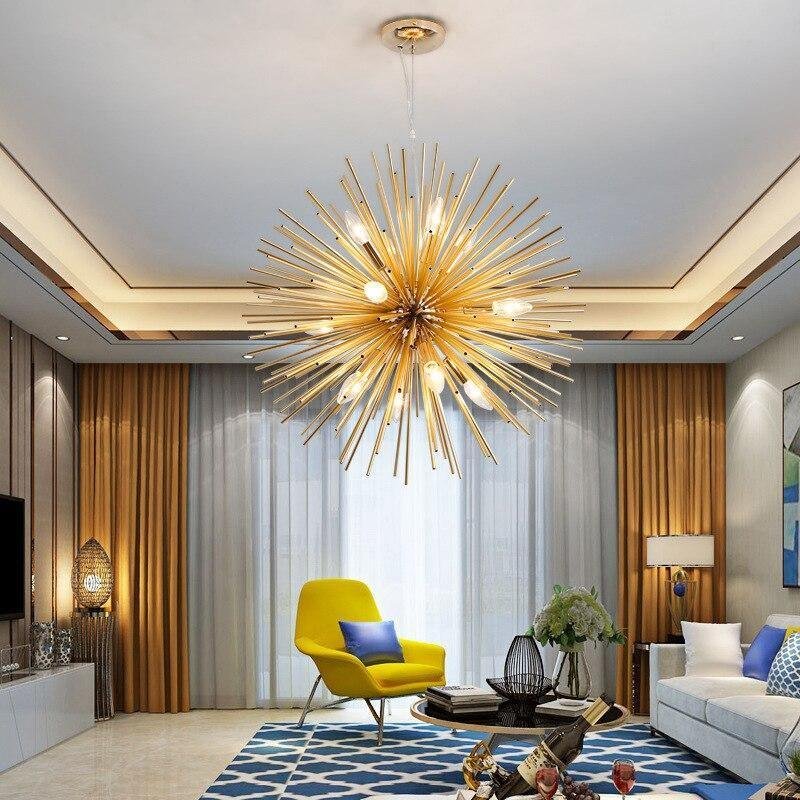 Ce plafonnier salon doré séduit par son design audacieux et luxueux. Inspiré d’un soleil rayonnant, il est composé de multiples tiges dorées disposées en étoile, intégrant des ampoules pour un éclairage puissant et homogène. Ce luminaire devient la pièce maîtresse de votre salon en apportant élégance et modernité. Fabriqué avec des matériaux de qualité, il garantit robustesse et durabilité. Facile à installer, il s’adapte parfaitement aux intérieurs contemporains, glamour ou art déco, créant une ambiance lumineuse et sophistiquée, idéale pour impressionner vos invités.