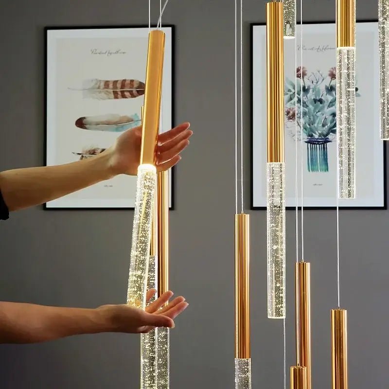 Illuminez votre salon ou salle à manger avec ce plafonnier au design moderne et raffiné. Composé de tubes suspendus en acrylique à bulles et finition dorée, il diffuse une lumière douce et élégante qui crée une ambiance chaleureuse et accueillante. Son style contemporain et luxueux apporte une véritable touche de sophistication à votre décoration intérieure. Idéal au-dessus d’une table de salle à manger ou dans un grand salon, ce luminaire devient la pièce maîtresse de votre espace. Son éclairage LED intégré assure une consommation énergétique réduite et un rendu lumineux optimal.